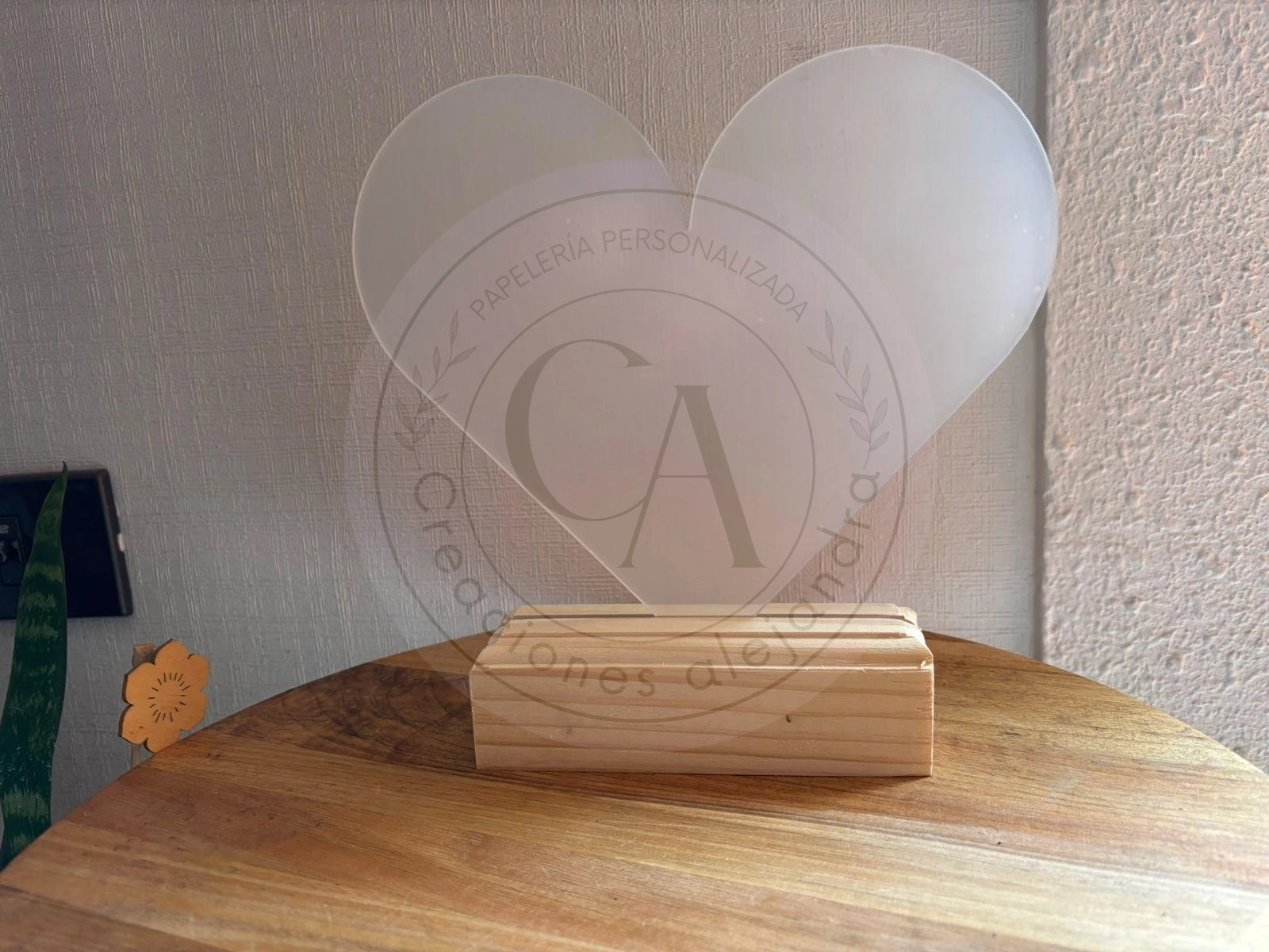 Corazón de acrílico de 20x16cm de grosor 3mm cortado con precisión láser, transparente y listo para personalizar. Incluye una base de madera de 14cm para soporte.