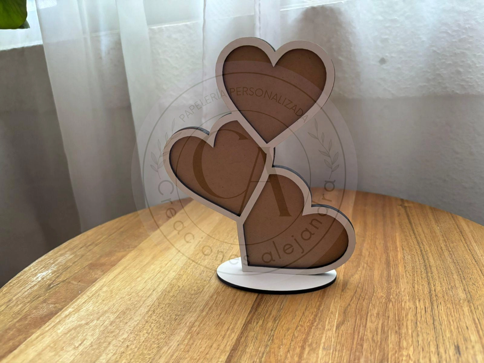 Impresionante porta retratos con forma de 3 corazones elegantemente diseñado. Esta pieza de decoración cuenta con una altura de 16,5cm y viene con una base duradera de MDF blanco que puede ser personalizada a través de la sublimación. El diseño corazón es desmontable, ofreciendo la opción de añadir un toque personal ya sea sublimando o insertando fotos con papel fotográfico.
