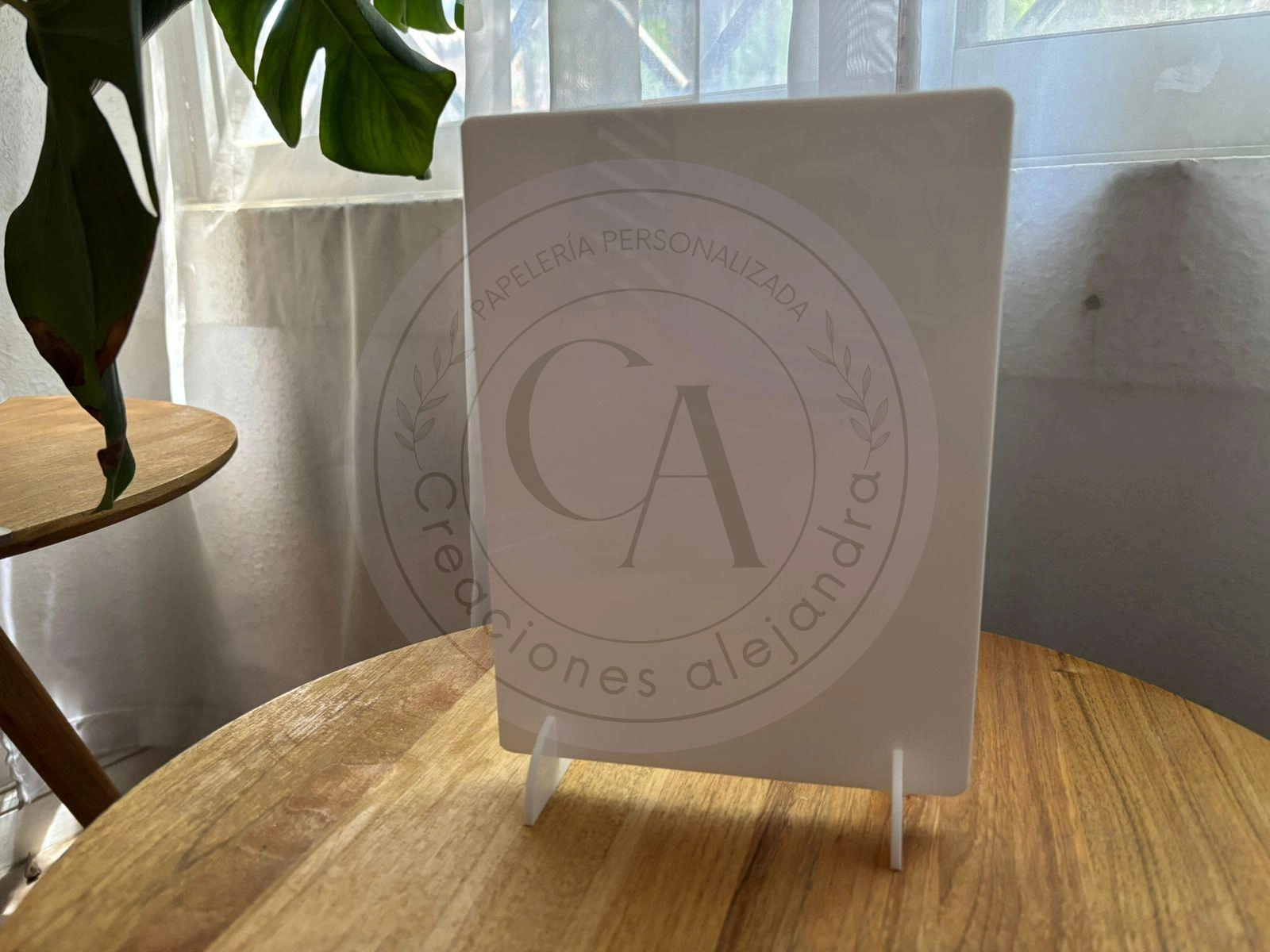 Cuadro de acrílico blanco de 3mm, con medidas de 15x20 cm, ideal para personalizar con métodos DTF UV o sublimación. Se acompaña por un soporte de acrílico para un montaje fácil y seguro.
